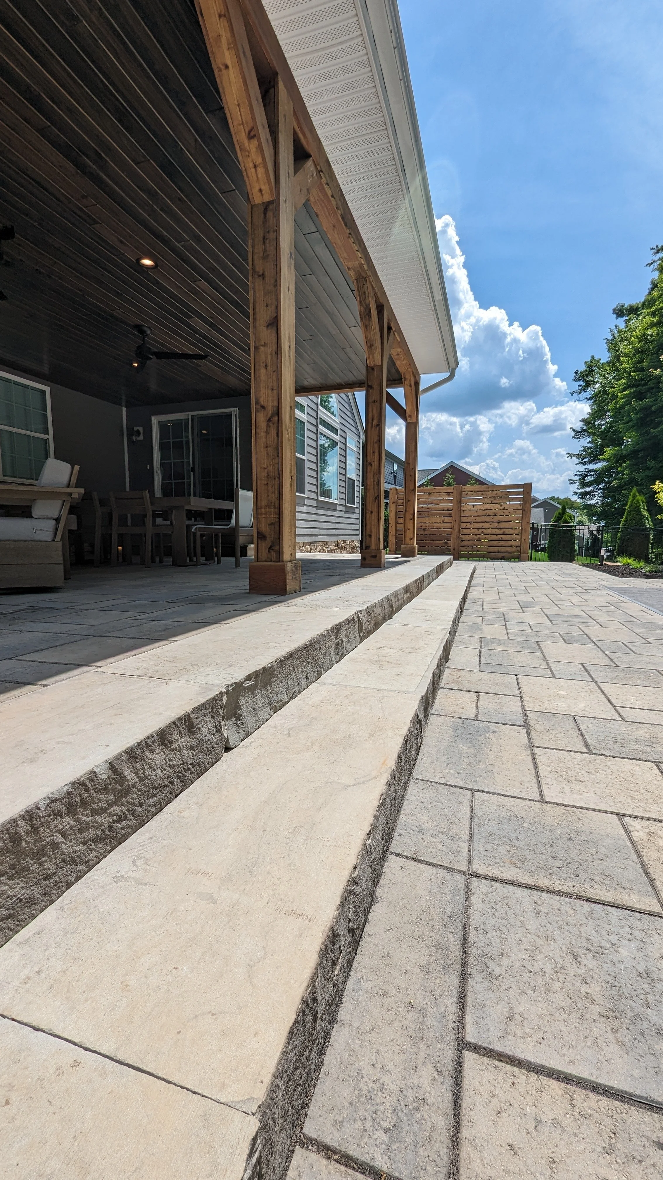 Back patio with stone steps, covered porch with wooden posts, outdoor dining and seating area, brick and wooden fencing, blue sky with clouds, and green trees.